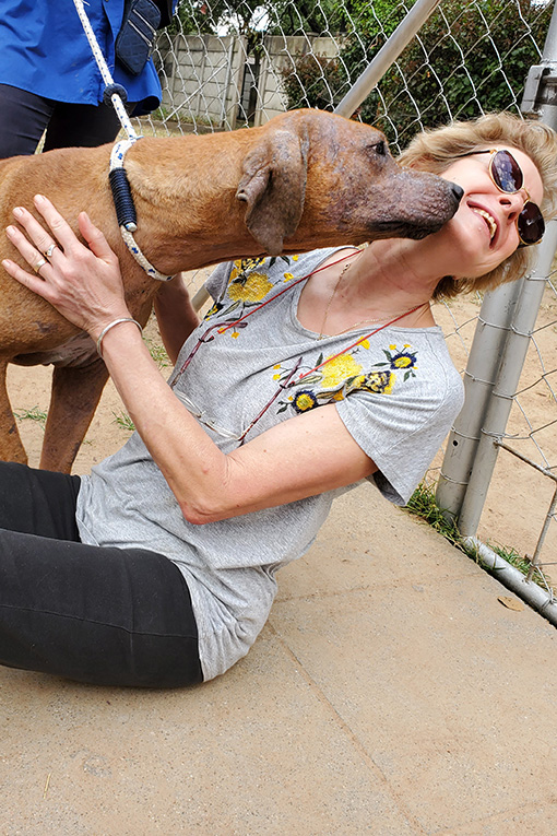 It was quickly discovered that her stomach was not in good shape – no surprises there as who knows what she’d been eating on the streets. Jenny Fynn and others on the local Rhodesian Ridgeback group quickly rallied round and with Marianne worked out a supply of chicken and rice. She put on weight but was slow to respond to the mange treatment which was bothering the team at the SPCA. Then last week it was decided that we’d turned the corner as she was growing a new coat of hair and had put on weight. We went out to the SPCA to see her.