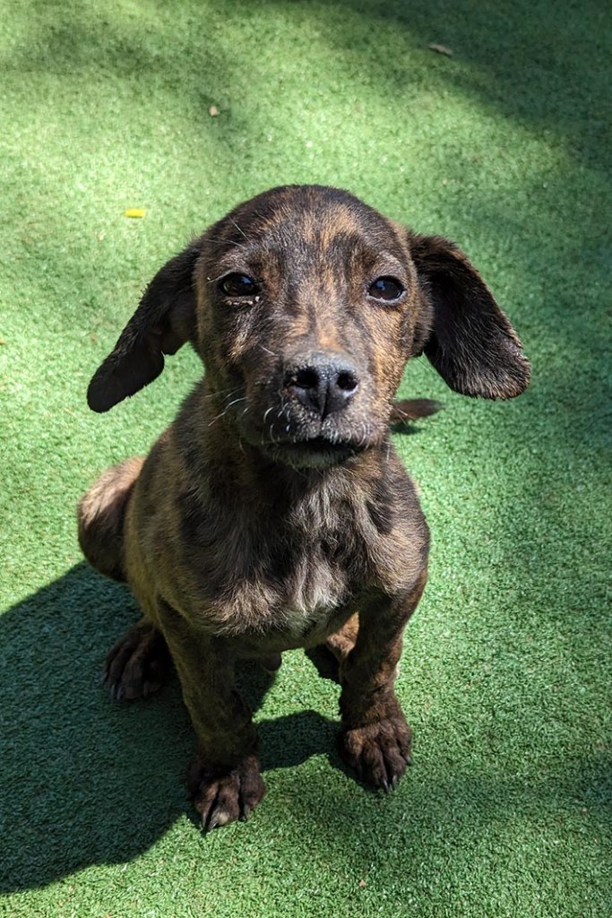 Poor little fellow, I hope someone offers him a home. Both he and Molly instinctively knew how to sit when being offered food. I tried Molly with the human version of a play-bow; patting the ground with both hands flat. She responded by tearing around the pen! I think she’ll fit right in.