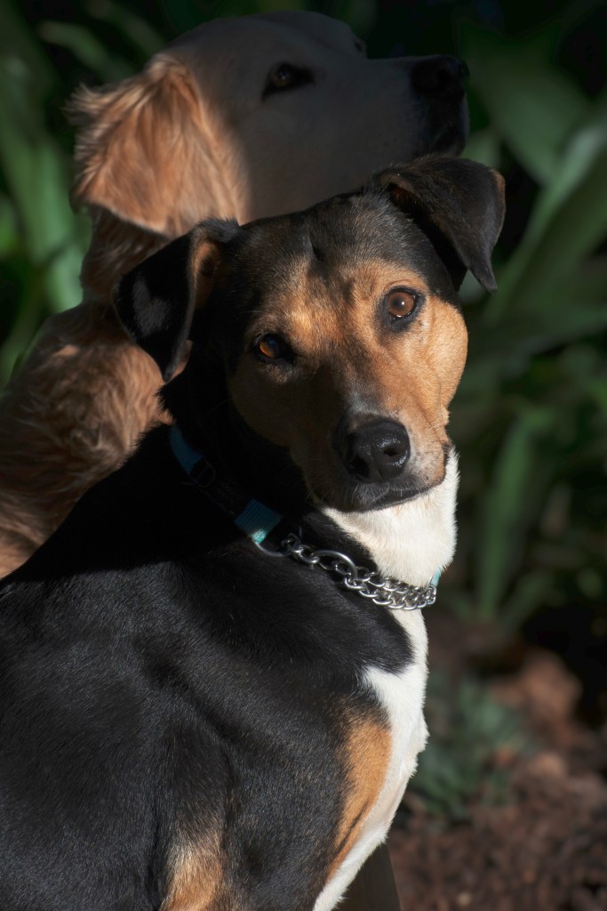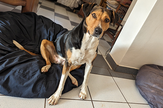 We got Greeta from the SPCA last October. She’d been the office dog and was showing the result of all the treats – a little bit rotund she was! She got her name as she loved greeting all the visitors and we were assured she loved playing with other dogs. We were looking for a younger playmate for Themba (Tia is about 9 now and not so keen on playing), she seemed ideal and it didn’t take her long to fit in.