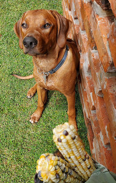 He had his first bone this morning. There’s no real reason we waited this long. We made sure Roxy was not around and Marianne said she did her usual drama queen act; carrying her bone around the house and whining until it was taken away. I did watch Themba in the garden in case he thought of going to see what Tia was up to (she’d have given him plenty of warning to push off) but he was engrossed in his and made a good job of sorting it out. Then we did a tour of the garden where I picked some mealies that he thought he’d like too (above).