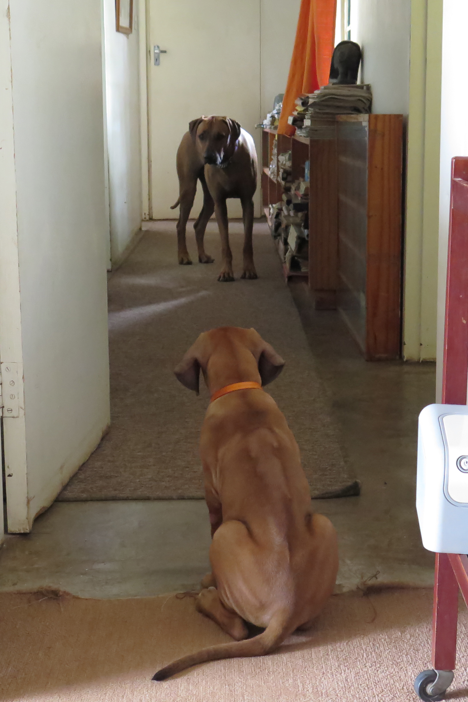 Molly was found on the streets of Marondera, a small town about 80km to the east of here, just over a month ago. Marianne saw a post about how nobody had come forward to claim her and her future was not looking good so we decided to meet her. So last Wednesday we took along Themba and Tia to the ZNSPCA office on Enterprise road to see how they got along. They got on fine if one can call ignoring each other that. Molly (she didn’t have a name then) eventually came up to me for attention.