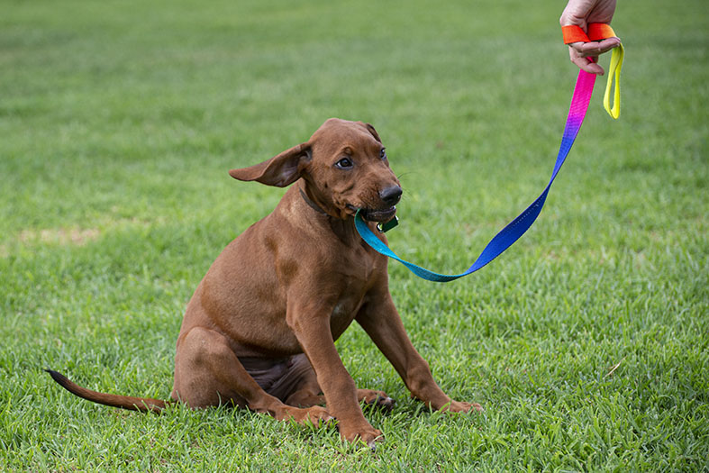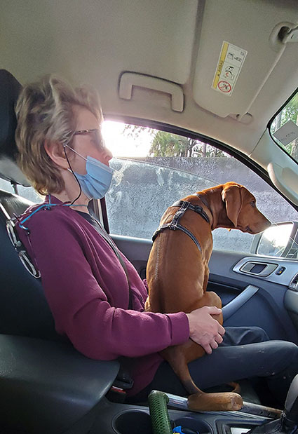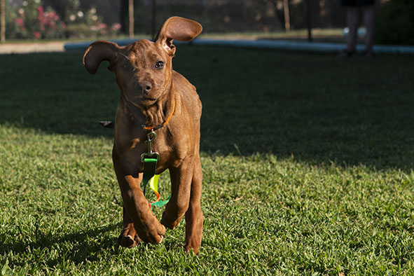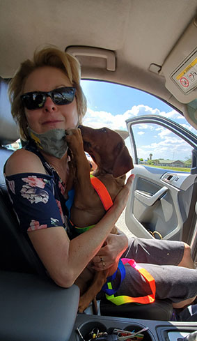 Poor little fellow, I hope someone offers him a home. Both he and Molly instinctively knew how to sit when being offered food. I tried Molly with the human version of a play-bow; patting the ground with both hands flat. She responded by tearing around the pen! I think she’ll fit right in.